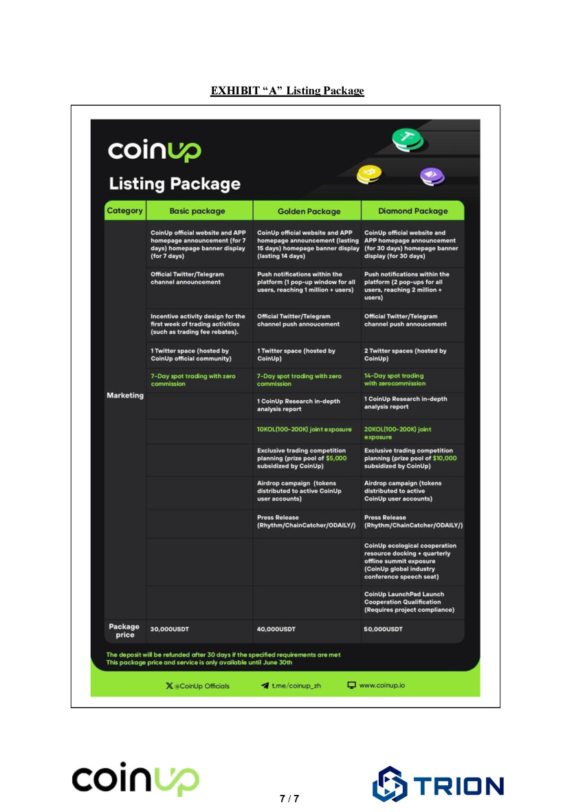 세계 제1의 거래소인 바이낸스와 거래량 1, 2위를 다투는 세계 42위(CoinMarketCap은 트래픽, 유동성, 거래량 및 보고된 거래량의 정당성에 대한 신뢰도를 기준으로 거래소의 순위를 매기고 거래량을 파악합니다.)의 CoinUp 거래소에 상장이 승인되었으며, 다이아몬드 패키지 서비스를 제공받기로 하였읍니다.