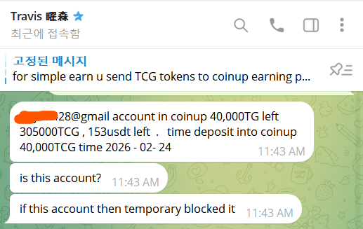 기 공지한바, 불법거래자가 원복을 이행하지 않음과 동시에 소명이 충분하지 아니하고 해킹을 당했다고 주장하고있어 코인업과 공조하여 최초의 코인업 계정과 Feb-13-2026 03:35:59 PM UTC에 추가로 4만개를 입금한 계정을 잠금조치하였습니다. 본 프로젝트의 의장이 해외출장에서 복귀하는대로 한국의 사법당국에 고발하여 조사를 진행토록 할 예정입니다.